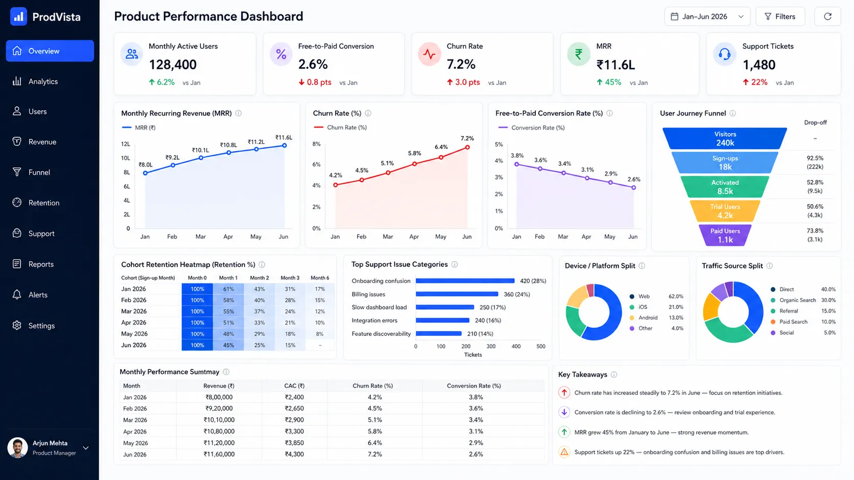 Analyse this product dashboard screenshot. Determine the primary developments, doable issues, and what motion the staff ought to take subsequent.